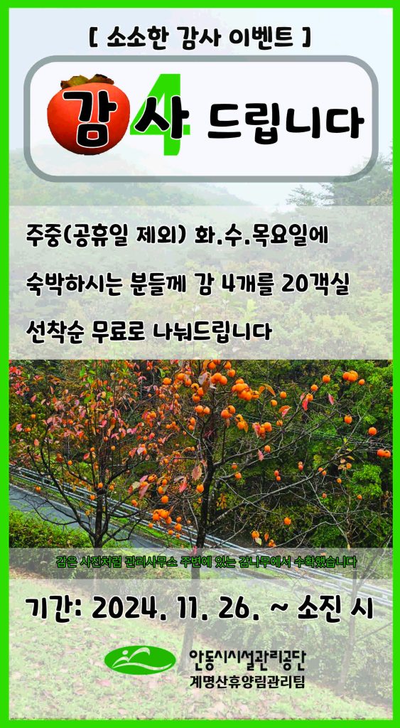 소소한 감사이벤트 홈 위치: 게시판 계명산자연휴양림을 이용하시는 분들께 고마움의 표시로 소소한 감사 이벤트를 진행합니다. 자연 그대로 숙성하고 있습니다. 떫은 감은 홍시가 될려면 3주정도 걸릴 듯 합니다. 3주동안 휴양림 직원들의 작은 정성을 담겠습니다. 계명산이벤트 답글 남기기 응답 취소이메일 주소는 공개되지 않습니다. 필수 필드는 *로 표시됩니다댓글 * 이름 * 이메일 * 웹사이트 다음 번 댓글 작성을 위해 이 브라우저에 이름, 이메일, 그리고 웹사이트를 저장합니다. Δ 글쓴이 me@andongsisul.kr 2025 숲속 즉석 사진관 이벤트 글 내비게이션 다음 글
