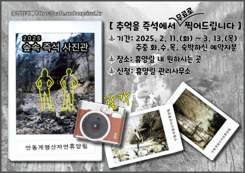 2025 숲속 즉석 사진관 이벤트 홈 위치: 게시판 이벤트 운영기간동안 관리사무소 방문 시 이용권 수령후 사용하실 수 있습니다. 휴양림의 좋은 추억들을 사진에 담아 가셨으면 합니다. 안동이벤트휴양림 글쓴이 me@andongsisul.kr 소소한 감사이벤트 글 내비게이션 이전 글다음 글