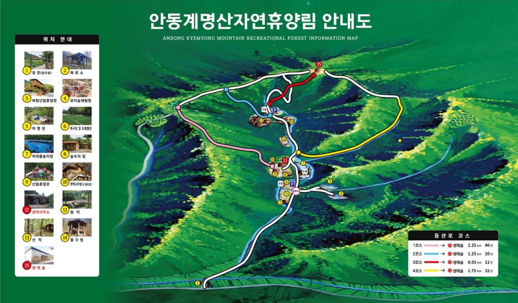 경상북도 안동시 길안면 계명산 자락에 자리 잡은 계명산자연휴양림은 소나무와 낙엽활엽수인 참나무가 조화롭게 어우러져 있는 조용하고 아늑한 분위기의 휴양림입니다.